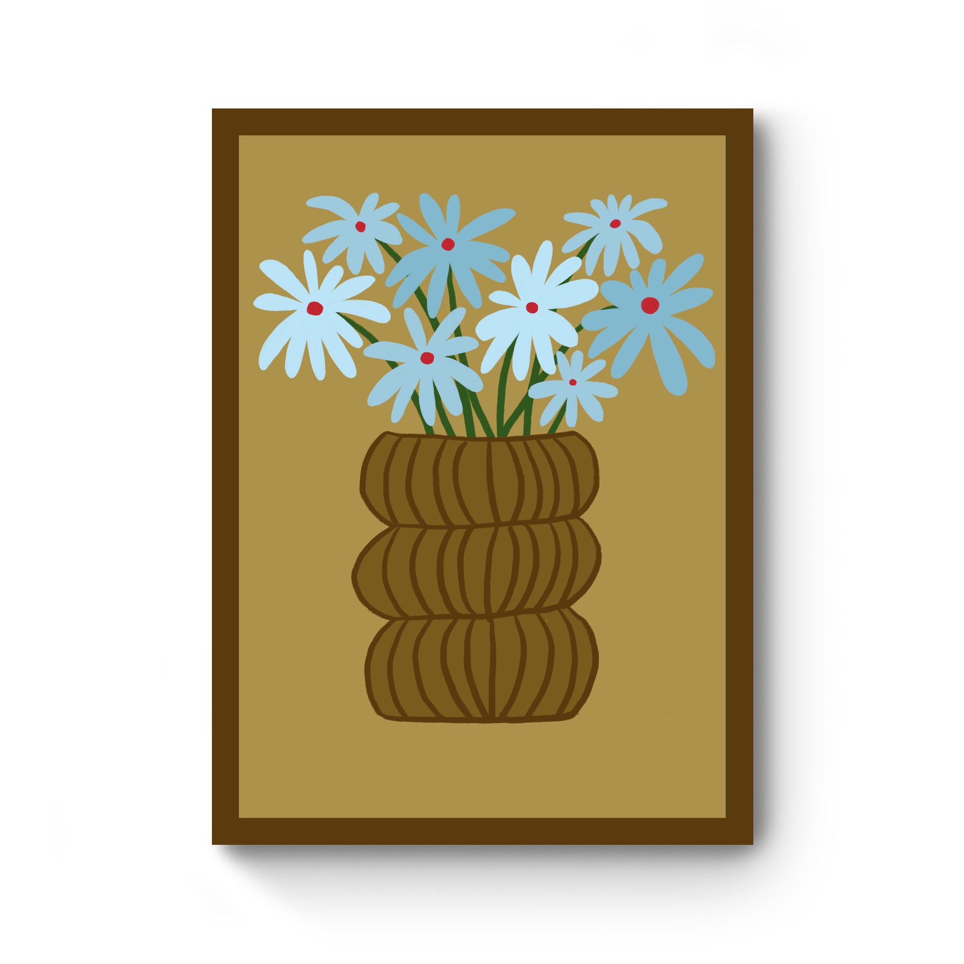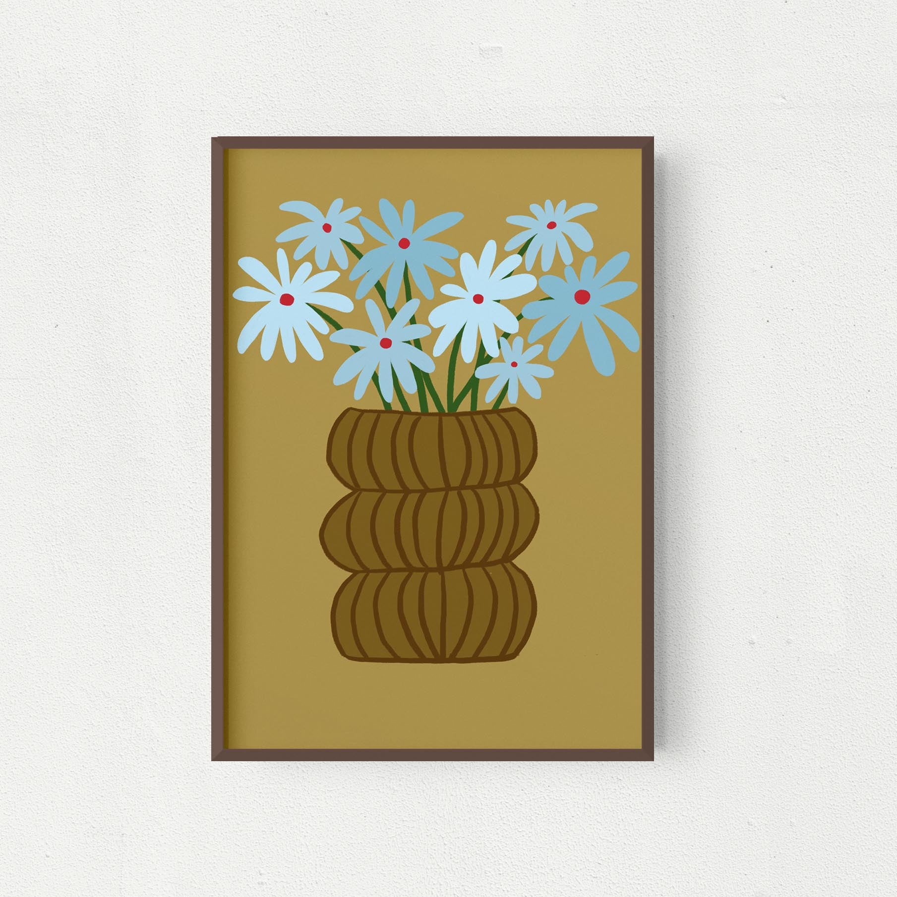 Embrace the unexpected with our "Flower Pot" art print. This hand-drawn piece features a captivating color palette of tan and blues, creating a unique and eye-catching composition. The pops of vibrant colour add a touch of whimsy to this unexpected floral arrangement.
